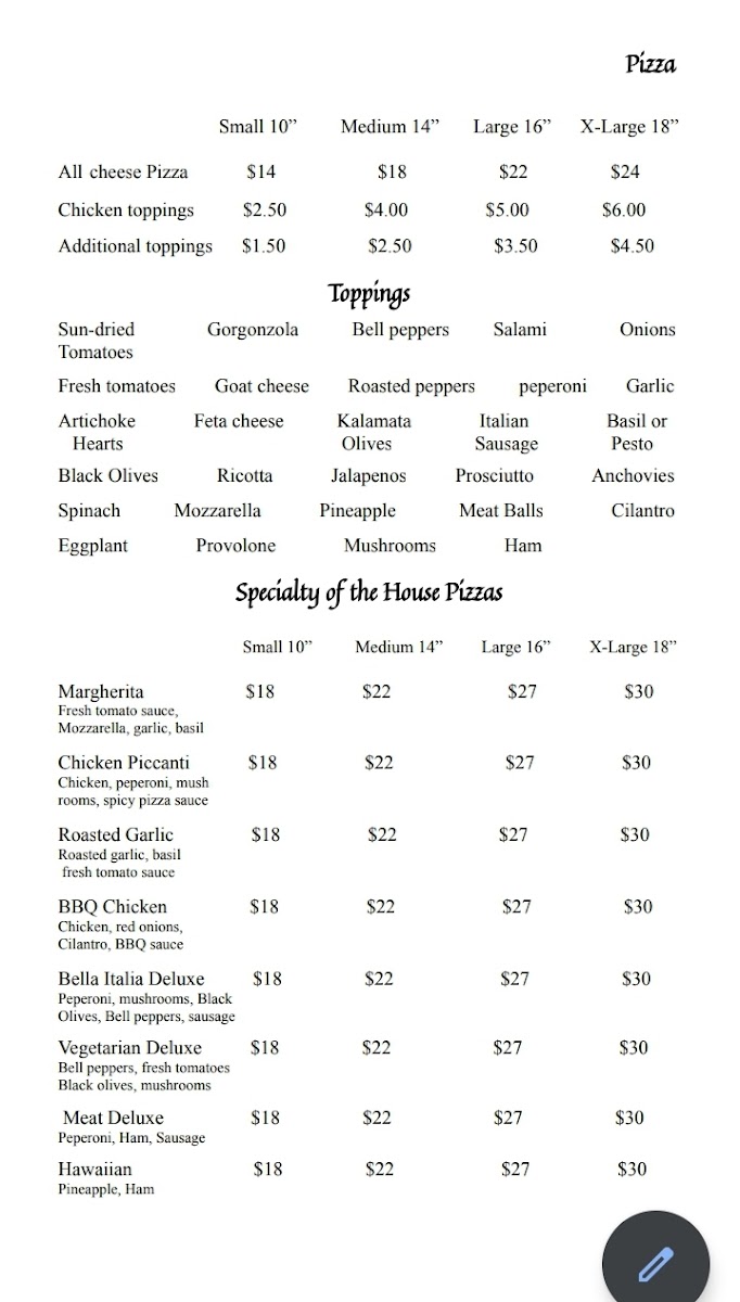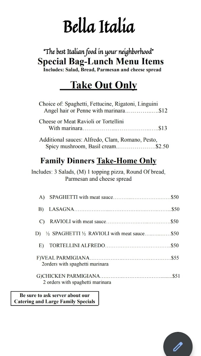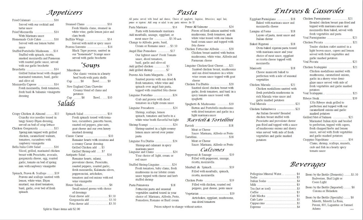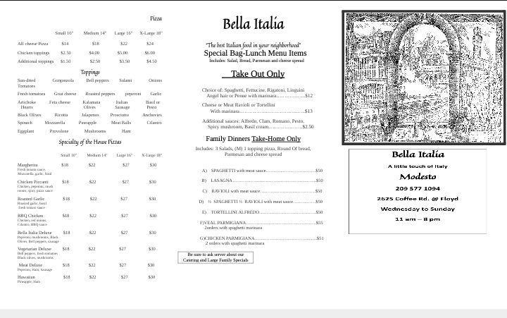 Bella Italia Menu
