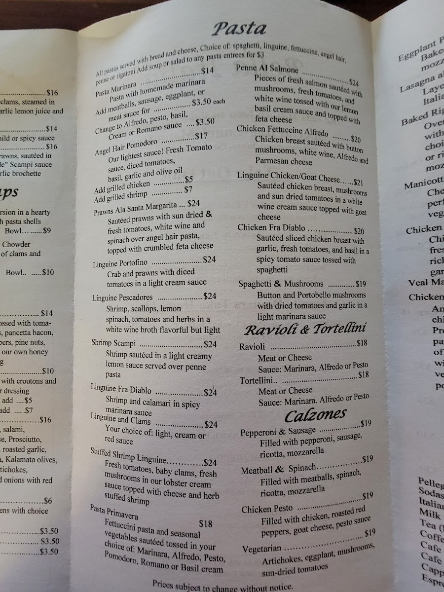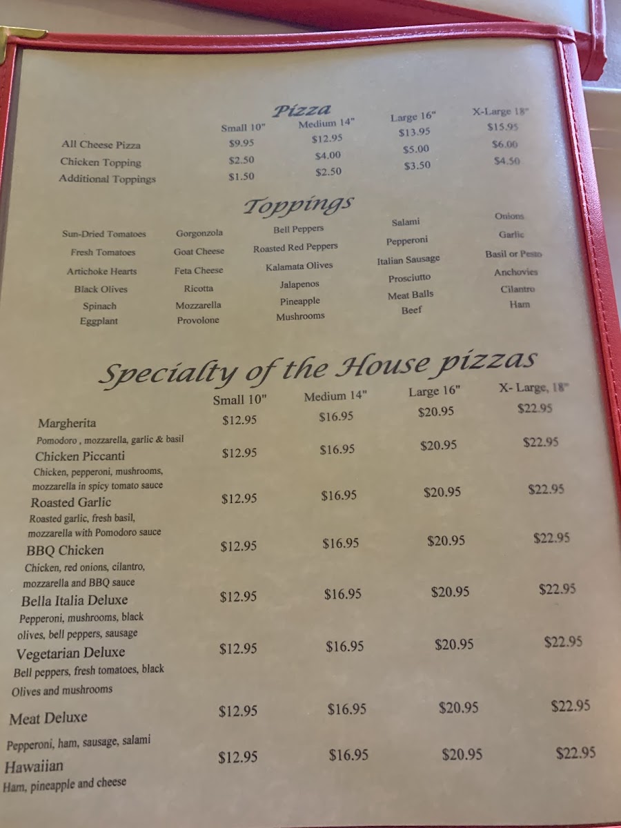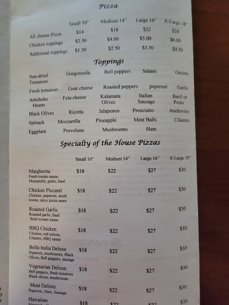 For pizza lovers, there are Specialty of the House Pizzas available, including Margherita, Roasted Garlic, Chicken Piccanti, Hawaiian, Bella Italia Deluxe, Meat Deluxe, and Vegetarian Deluxe. Additionally, several Calzones are offered with fillings such as Pepperoni & Sausage, Meatball & Spinach, Chicken Pesto, and Vegetarian options.