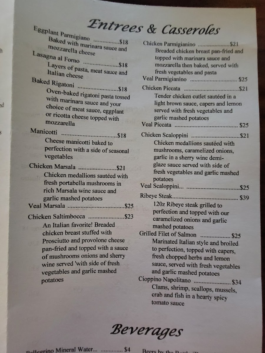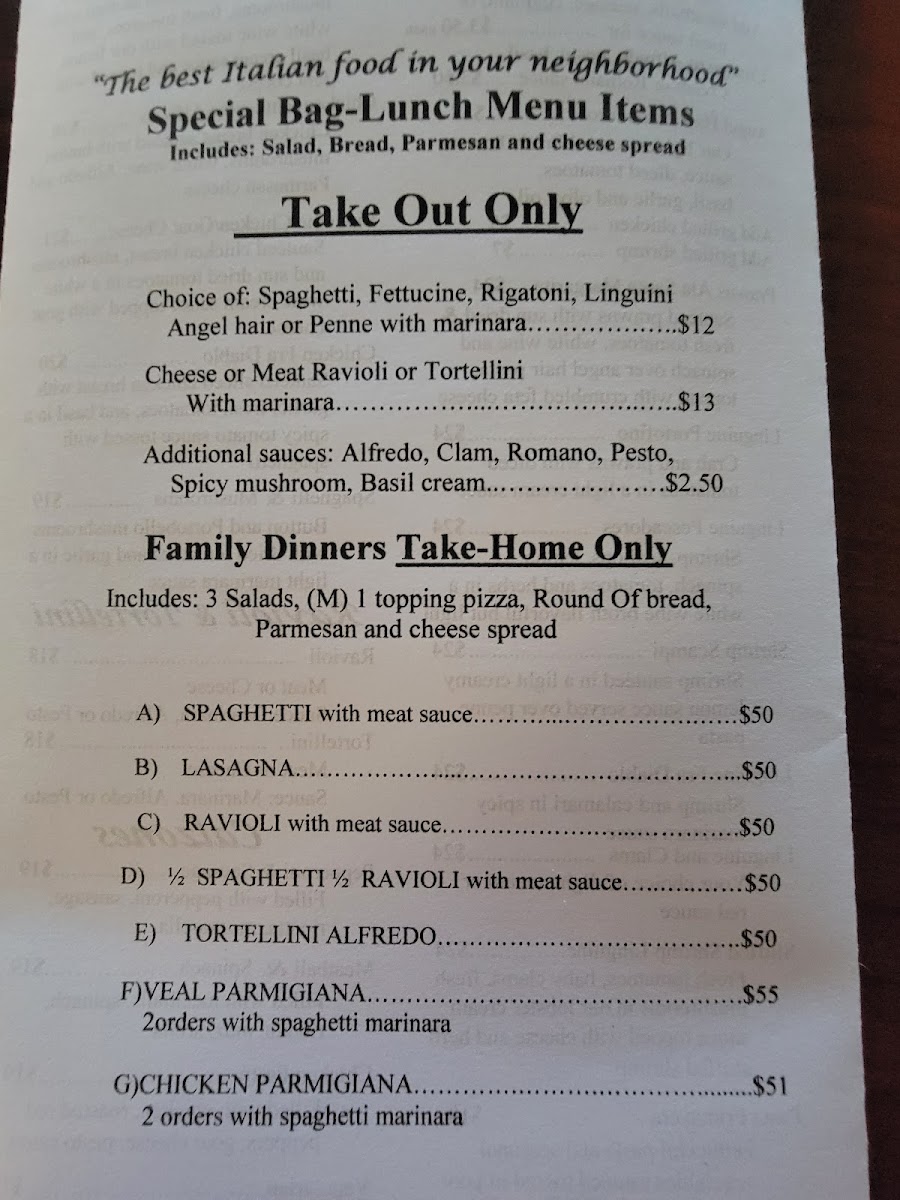 Main entrees and classic Italian dishes featured on the menu include Chicken Alfredo, Cioppino Napolitano, Chicken Marsala, Chicken Parmigiana, Spaghetti with Meatballs, Tortellini, Chicken Lasagna, and more. Side options and salads like Spinach Salad and House Bread are also available.