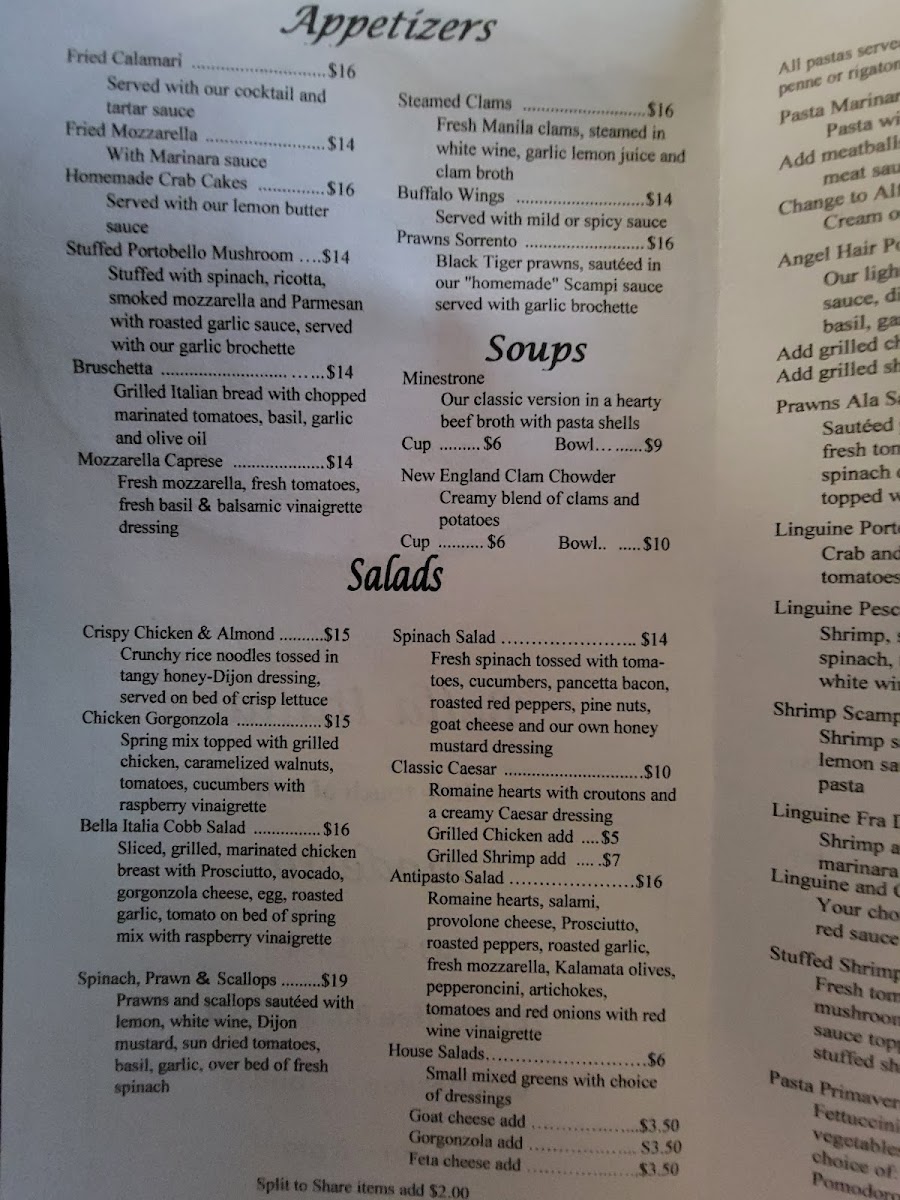 The menu at Bella Italia offers a variety of traditional Italian dishes, organized into several categories to suit different dining preferences. Appetizers include options such as Fried Calamari, Fried Mozzarella, Homemade Crab Cakes, Stuffed Portobello Mushrooms, Bruschetta, Mozzarella Caprese, Steamed Clams, Buffalo Wings, and Prawns Sorrento, providing a range of light starters.